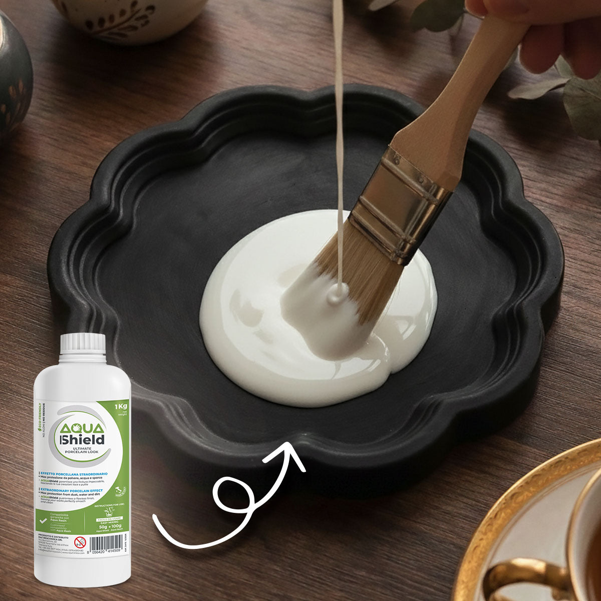 Applica Aqua Shield per sigillare e valorizzare la superficie. Puoi usarlo una volta asciutto o direttamente nella miscela con il gesso, al posto dell’acqua.